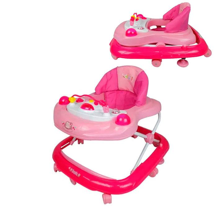 Aprender a caminar puede ser algo divertido y seguro para tu bebé. Edad recomendada de 6 a 18 meses. Medidas del producto: 65 x 60 x 56 cm. Disponible en colores rosa y azul. Tablero con juguetero musical e interactivo con luces decorativas. Asiento acolchonado para que el bebé disfrute de mayor comodidad. Cuenta con freno de seguridad para fijarla. Altura ajustable del asiento de acuerdo al crecimiento del bebé.