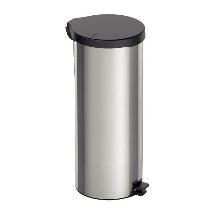 Fabricado con cuerpo de acero inoxidable, tapa pedal y base en polipropileno negro. Con el interior cerrado y liso, la bolsa de basura debe colocarse directamente en el contenedor y fijarse en el orificio lateral.