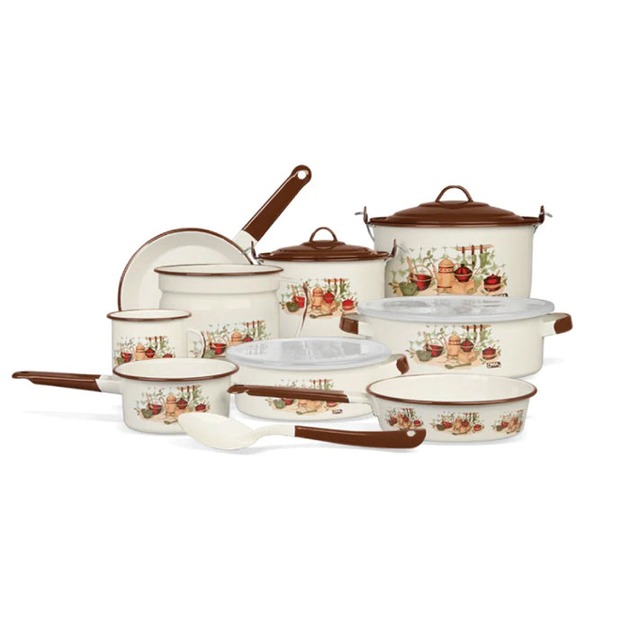 - Batería de acero vitrificado resistente y durable. El acero conserva el calor en la pieza.