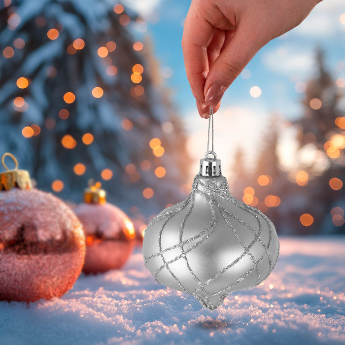 Esferas Navideñas con Glitter, Forma Cebolla, Color Plateado, 2 pzas