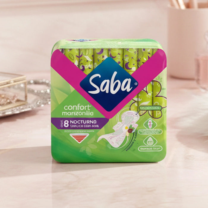 - Por las noches no hay cosa que desees más que tener un descanso perfecto, sobre todo cuando estás en tus días. Y si además puedes consentir tu piel y evitar cualquier irritación, vivirás las mejores noches. ¿Y cómo lograrlo? Muy fácil, con Saba Confort Manzanilla Nocturna con alas, que te ofrece la comodidad y seguridad que necesitas en esas noches.