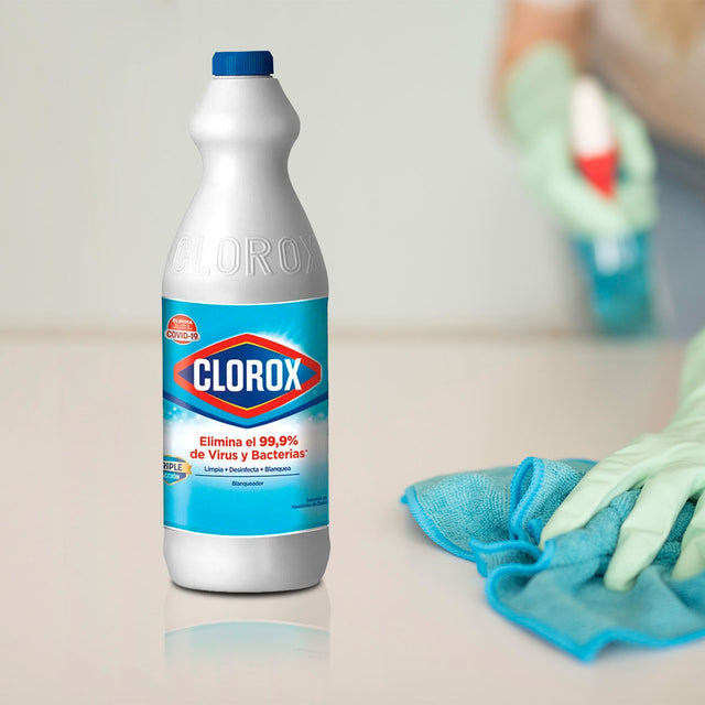 Cloro blanqueador líquido: Producto de la marca Clorox diseñado para ropa, loza, platos, tazas, inodoros y lavabos.
