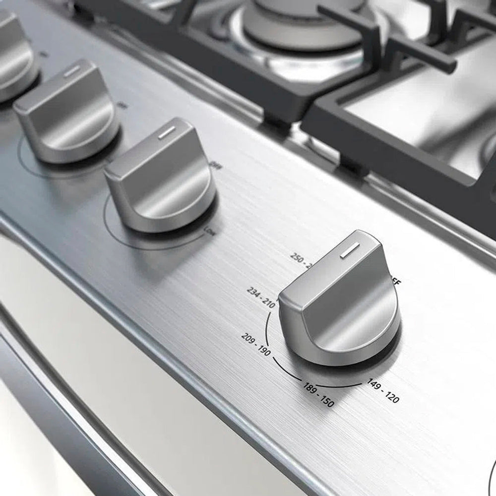 La Estufa de Piso WFR3400D de 30 pulgadas cuenta con 6 quemadores de aluminio (4 estándar y 2 jumbo) y 3 parrillas de alambrón que te permiten preparar diversos platillos a la vez. Tiene 7 perillas ergonómicas, su encendido es electrónico y su diseño con cubierta sellada de acero inoxidable te permite una fácil limpieza y dan un toque de elegancia y modernidad a tu cocina. Cuenta con tecnología EverClean que ayuda a la limpieza interior del horno y evita la acumulación de olores. Resistente a rayones y puerta con Door Stop System permite que la puerta Full Side door del horno se cierre de forma suave para mayor comodidad y facilidad. El horno es de encendido manual, tiene luz interior, jaladera tipo toallero que te facilitará su apertura, una parrilla y ventana para poder monitorear el horneado de tus alimentos. Esta estufa emplea Gas LP convertible a Gas Natural.