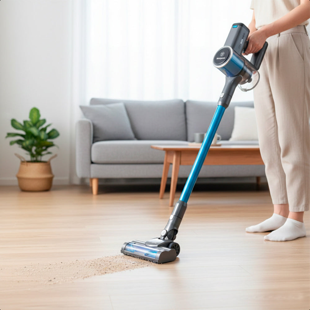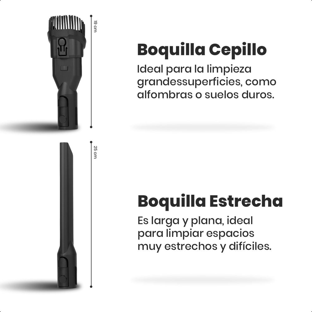 Con un diseño ligero y sin cables, es fácil de maniobrar en pisos, muebles y rincones. Incluye soporte de pared y accesorios como boquilla larga y herramienta 2 en 1, ideales para llegar a áreas difíciles.