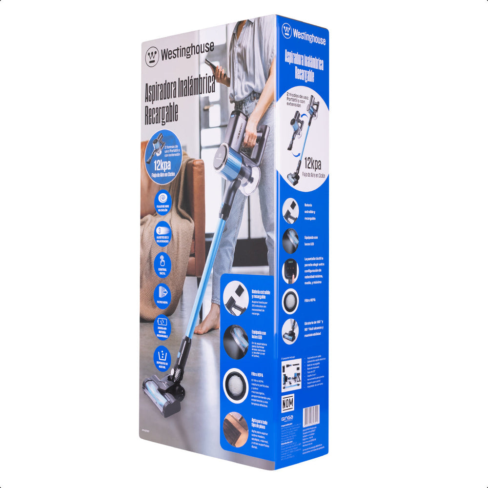 Mantén tu hogar impecable con la aspiradora inalámbrica Westinghouse, diseñada para ofrecer potencia, comodidad y un uso versátil en cualquier superficie. Su control de 3 velocidades permite ajustar la succión según tus necesidades, alcanzando hasta 12 kPa para una limpieza profunda.