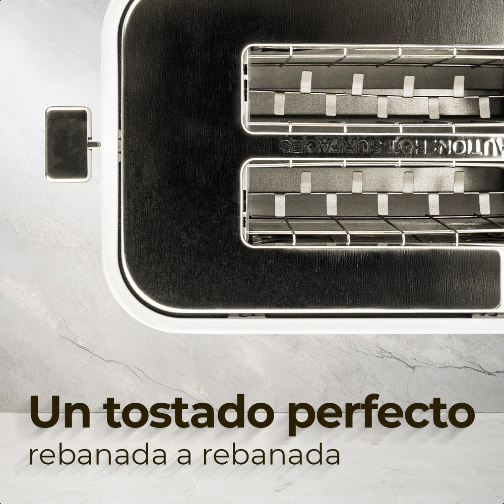Equipada con seis niveles de control y un tiempo de tostado completamente ajustable, esta tostadora le permite personalizar cada preparación exactamente como le gusta. Esta tostadora incorpora múltiples funciones especializadas, como Bagel, Recalentar, Descongelar, Cancelar, Cereal y Sin Gluten, brindando versatilidad para cualquier tipo de pan. Su bandeja de migas extraíble facilita la limpieza diaria, mientras que la palanca cromada aporta un toque decorativo elegante que eleva la presencia del aparato en la encimera. Con potencia de hasta 980 W y un sistema de almacenamiento integrado para el cable, combina eficiencia con practicidad en un diseño moderno que destaca en cualquier cocina. Más que una tostadora, es un esencial con estilo para transformar cada mañana en un inicio delicioso y perfectamente tostado.