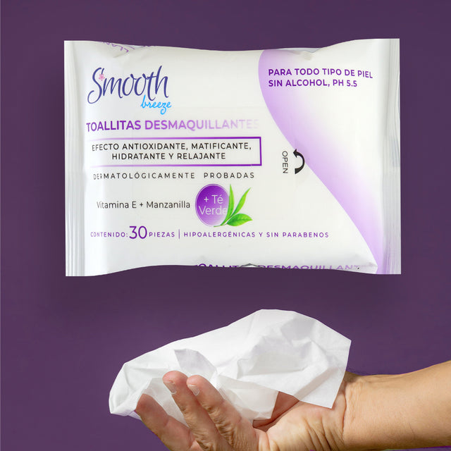 - El primer paso de tu rutina de cuidado de la piel debe ser una limpieza facial con las toallitas desmaquillantes Smooth Breeze.
