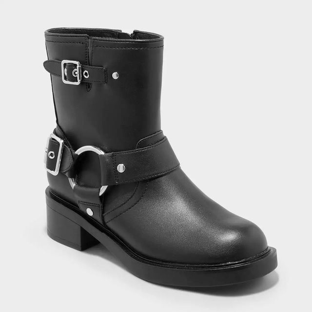 - Punta redonda cerrada y correas de arnés acentuadas con hebillas plateadas, cabezas de clavos y un anillo para darle un toque de moto elegante.