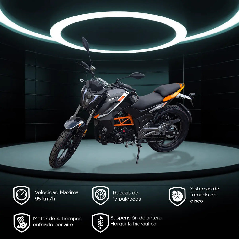 La Kiwo Ak250 posee un contundente motor 250 c.c. y un desempeño deportivo que le añaden una cuota de vértigo y diversión aun a los caminos más tediosos. Su escape corto HPF con filtro de doble sonido acentúa los tonos roncos del motor, otorgándole un sello único a su manejo capaz de anunciar tu llegada incluso a la distancia.