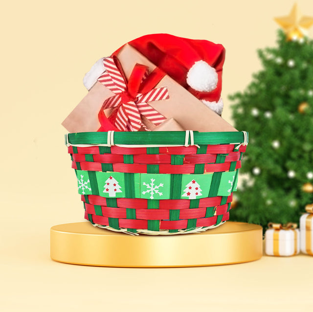 Canasta Navideña Ovalada de Bambú en color Rojo con Verde