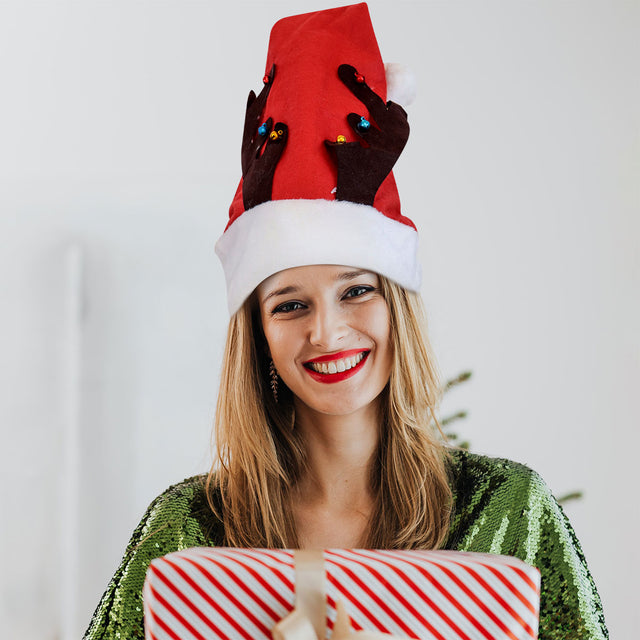 - Material suave: Gorro de Santa Claus con cuernos de reno de felpa hecho de tela suave con gran sensación al tacto.