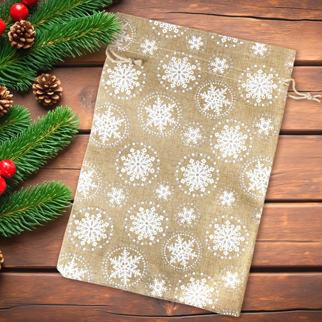 Bolsa de Yute Navideña, Diseño Copos de Nieve