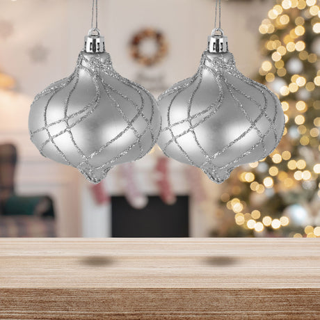 $ 2999Precio unitario /AgotadoPoca disponibilidad (10 unidades)Esferas Navideñas con Glitter, Forma Cebolla, Color Plateado, 2 pzas