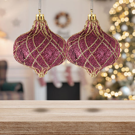 Esferas Navideñas con Glitter, Forma Alargada, Color Vino, 2 pzas