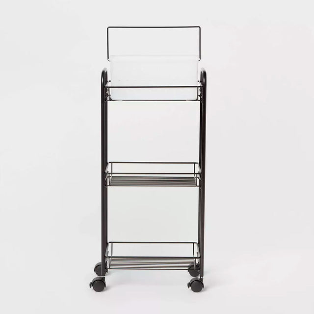- Diseñado con una mezcla de metal y plástico, este carro de almacenamiento negro cuenta con estantes alambrados para guardar cómodamente toallas de baño, cajas de almacenamiento y otros artículos.
