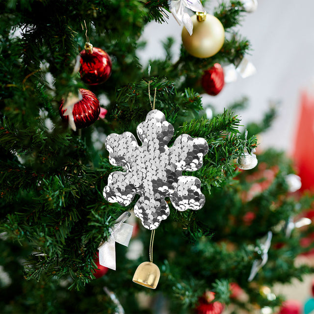 - Añade un toque de encanto invernal a tu decoración navideña con este copo de nieve adornado con lentejuelas.