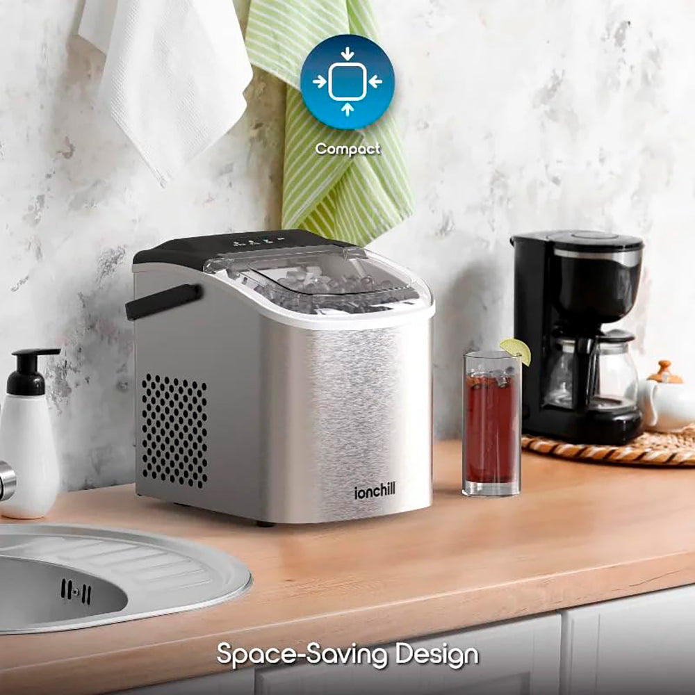 - El modo autolimpieza y la construcción de acero inoxidable facilitan el mantenimiento. Ya sea que estés haciendo batidos o cócteles, el Quick Cube de ionchill es la forma más fresca de hacer hielo.
