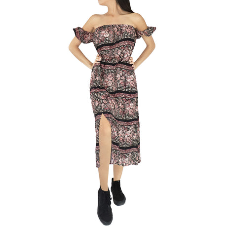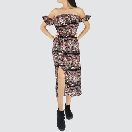 Vestido Casual con Hombros Descubiertos para Dama, color Vino con Negro