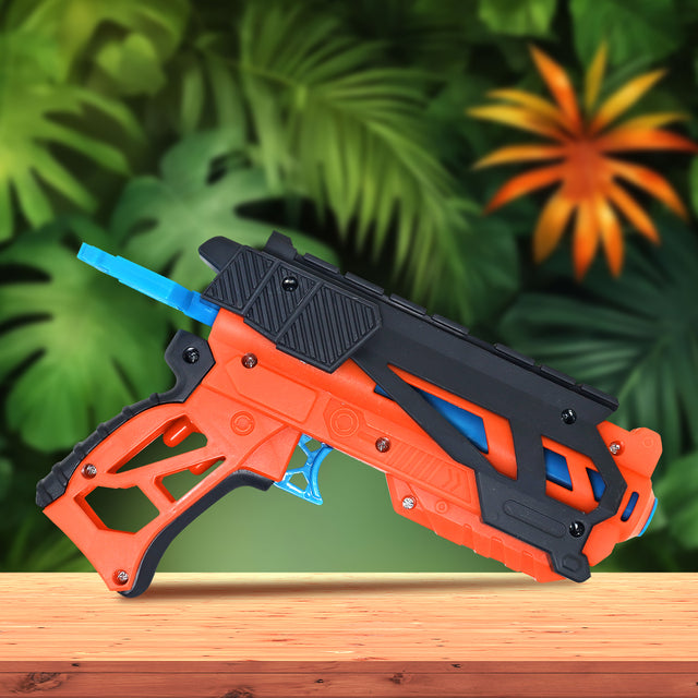 - Simplemente presiona para abrir el cargador, carga los dardos de espuma, bombea el protector de mano hacia atrás y tira del gatillo para disparar