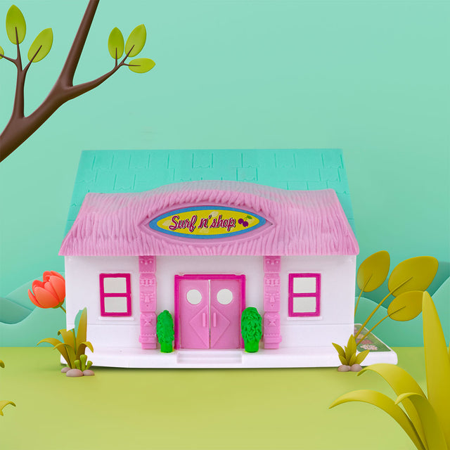 - Es una linda casa de plástico que luce en color rosa, azul y blanco, además, incluye algunos accesorios para hacer más entretenida la hora del juego.