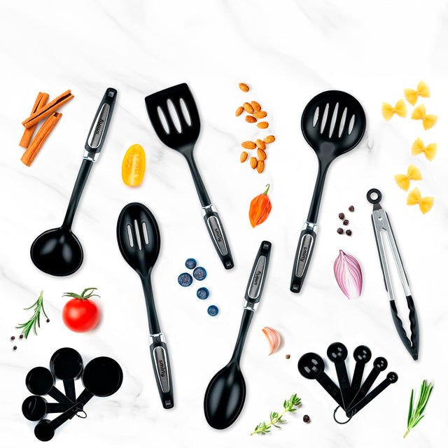 - 16 piezas esenciales: Incluye espátulas, cucharones, pinzas y más.