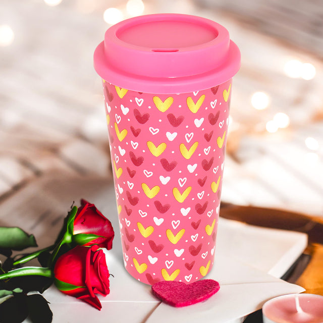 Vaso para Café con Diseño de Corazones y Tapa Rosa