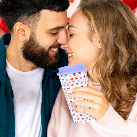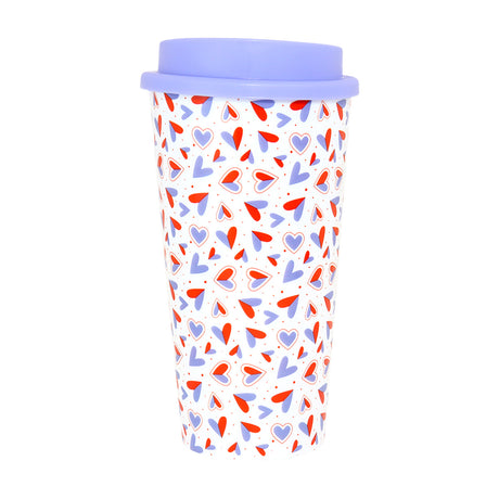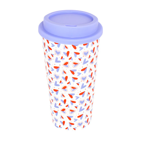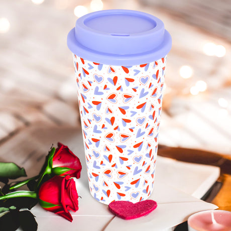 Vaso para Café con Diseño de Corazones y Tapa Morado