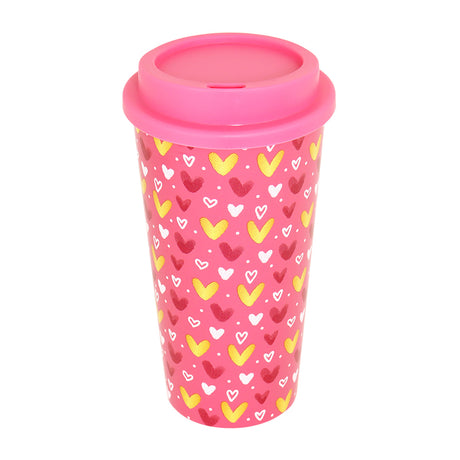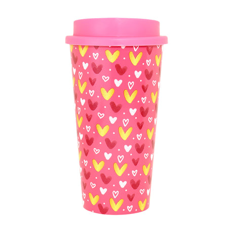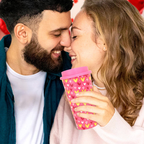 Vaso para Café con Diseño de Corazones y Tapa Rosa