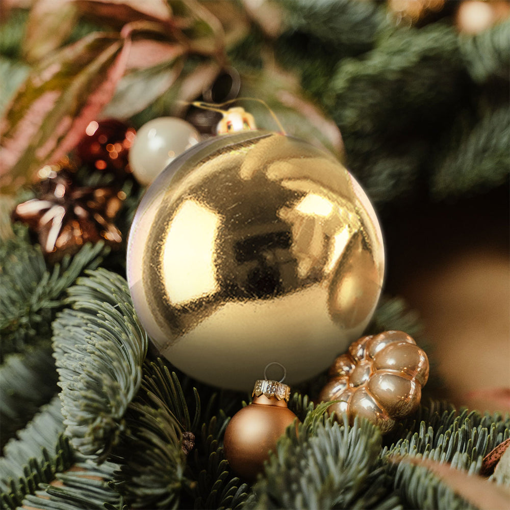 • Esta grande esfera para adorno de Navidad combina la belleza y el brillo del cristal real con la practicidad irrompible del plástico.