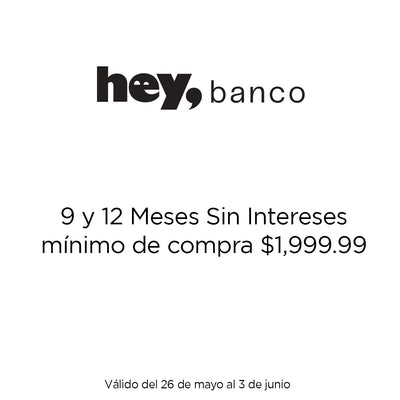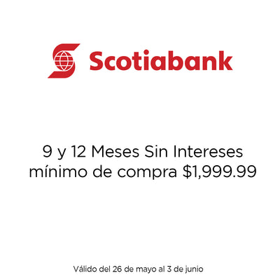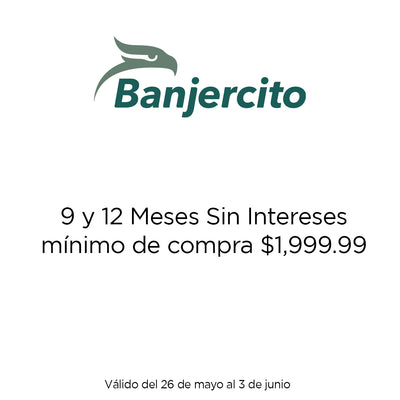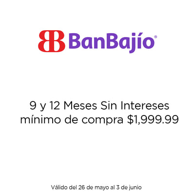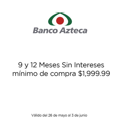 9 y 12 meses sin intereses aplican pagando con un monto mínimo de $1,999.99. Vigencia del 26 de mayo al 03 de junio del 2025.