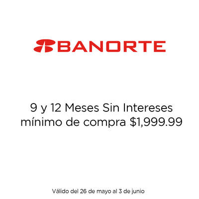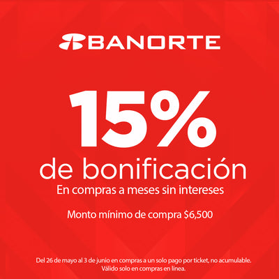 15% de Bonificación en compras a meses sin intereses mayores $6,500 por ticket, no acumulable. Válido solo en compras en línea. Vigencia del 26 de mayo al 03 de junio del 2025. Los Meses sin Intereses aplican directamente en el comercio en productos, categorías y servicios participantes. Participan las Tarjetas de Crédito Banorte excepto Básica, Banorte Conmigo, Empuje y Corporativa. La bonificación es operada por Banorte, limitada a $5,000 pesos por cuenta y se verá reflejada mes con mes durante el plazo que realizaste tu compra.