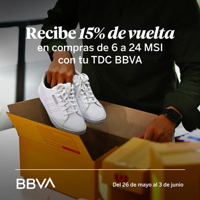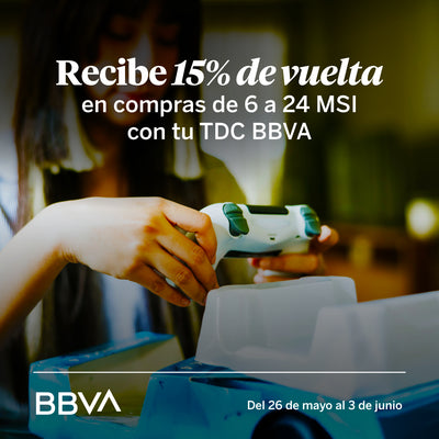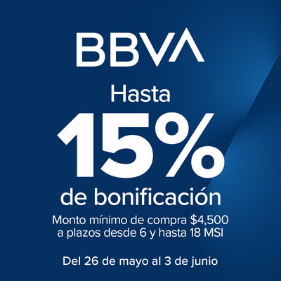 Hasta 15% de bonificación en automático en compras a partir de $4,500.00 MXN a plazos desde 6 y hasta 18 MSI. Vigencia del 26 de mayo al 03 de junio del 2025. Obtén hasta 15% de bonificación en automático al realizar compras a partir de $4,500.00 MXN a plazos desde 6 y hasta 24 meses sin intereses con tarjetas de crédito físicas y digitales BBVA incluyendo tarjetas titular y adicionales en comercios electrónicos participantes. Monto máximo de bonificación $2,500.00 MXN por día y por cliente durante la vigencia de la promoción. Participan las tarjetas de crédito físicas y digitales BBVA: Azul, Educación, Rayados, Oro, IPN, Afinidad UNAM, VIVE, Platinum e Infinite. Consulta términos, condiciones y restricciones aquí: https://bbva.mx/hotsale