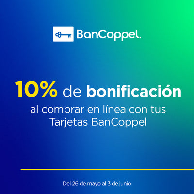 10% de bonificación* al comprar en línea con tus Tarjetas BanCoppel. Vigencia del 26 de mayo al 03 de junio del 2025.