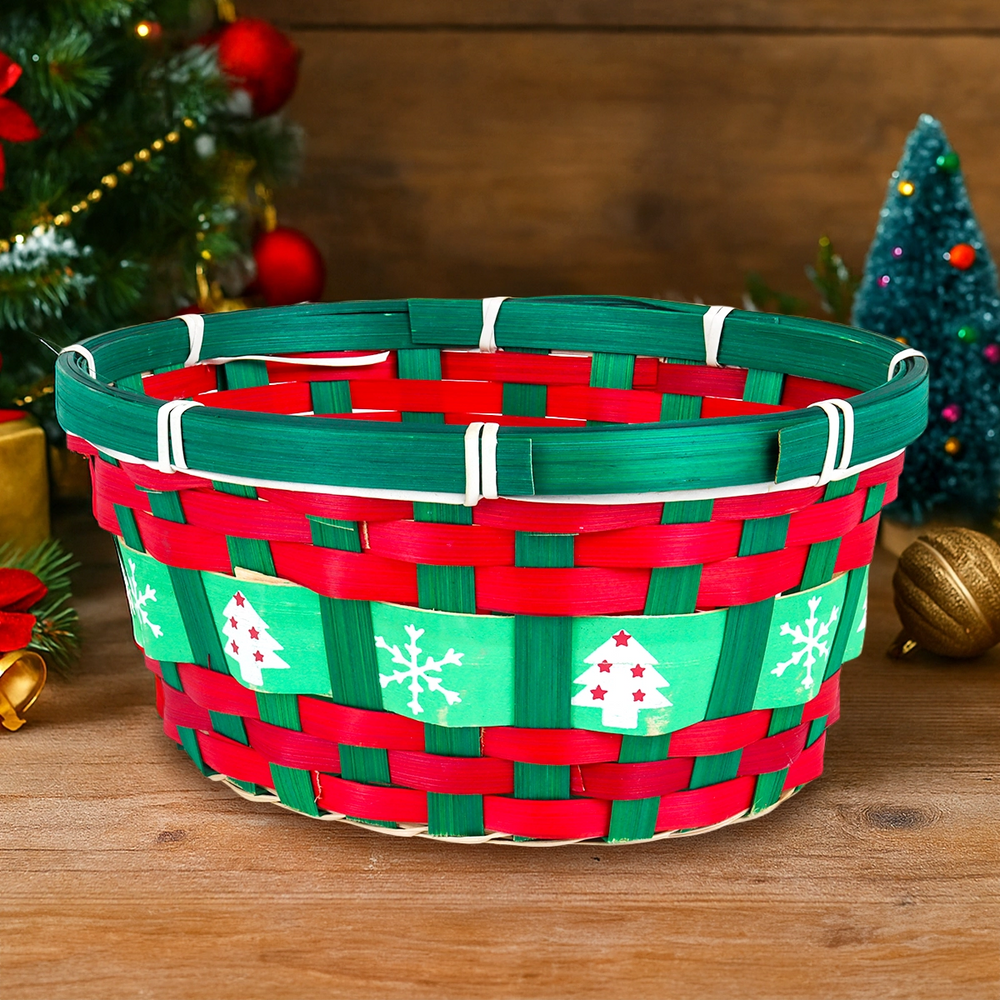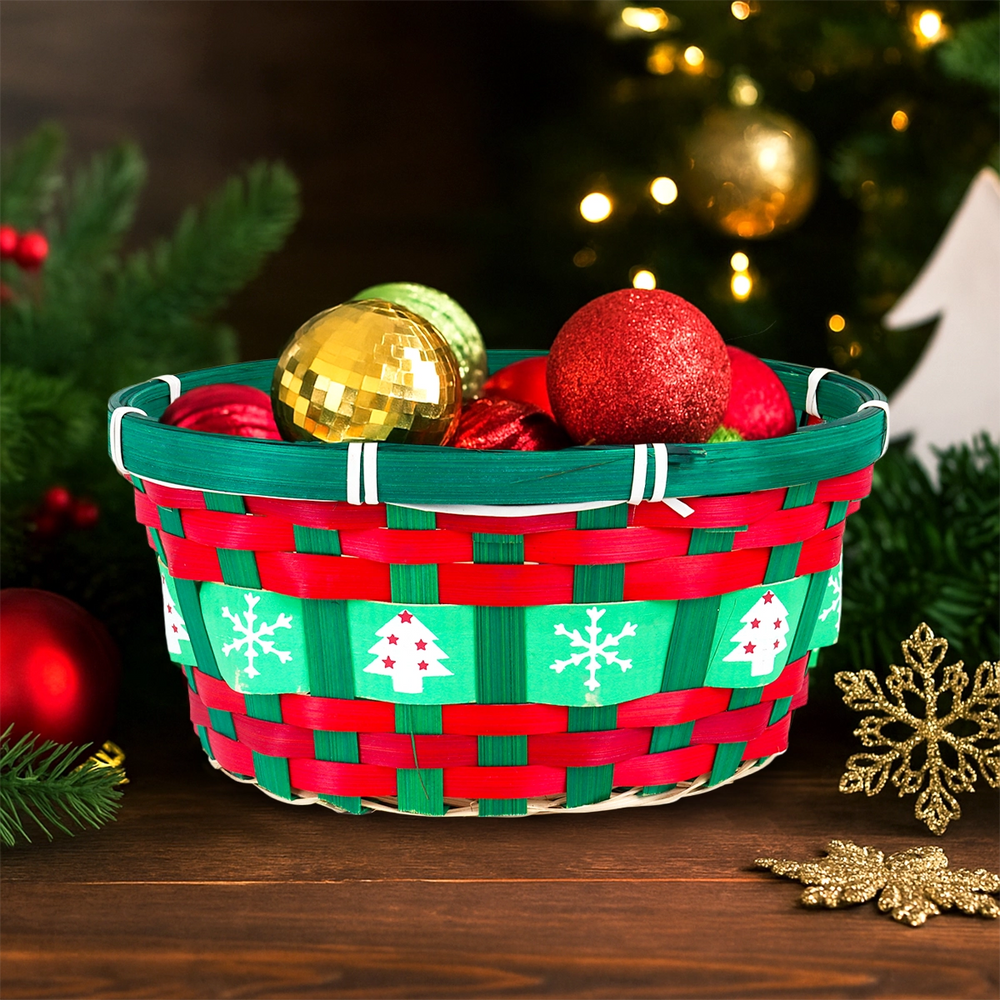 Añade un toque festivo y elegante a tus decoraciones con esta encantadora canasta de bambú en colores clásicos de Navidad.