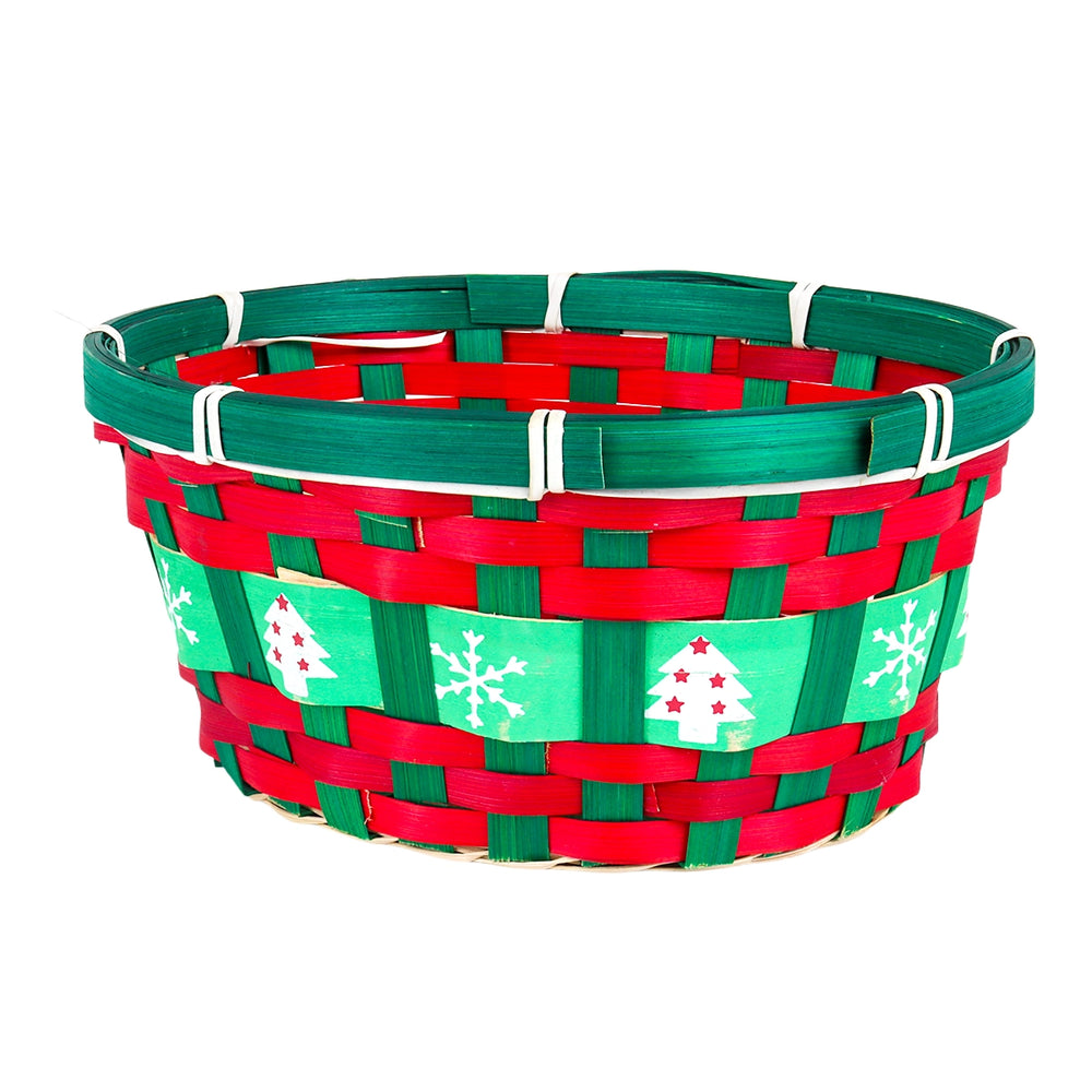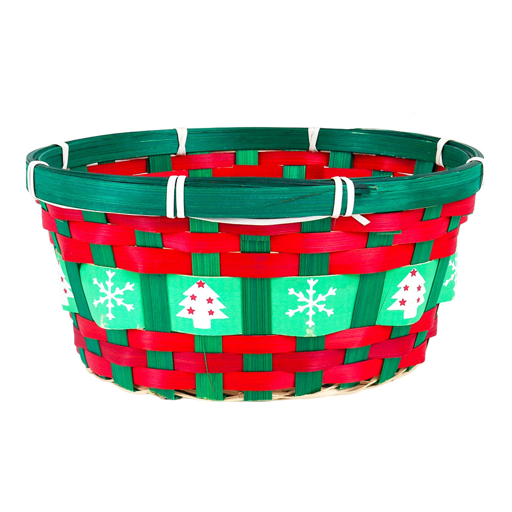 Canasta Ovalada Navideña de Bambú, Color Verde y Rojo