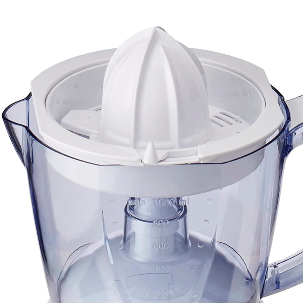 Potente motor de 127V, 25 watts Exprimidor de dos conos para naranjas y limones Mecanismo de arranque y apagado automático Jarra de vertido fácil de 1L Accesorio que permite verter directamente el jugo en el vaso