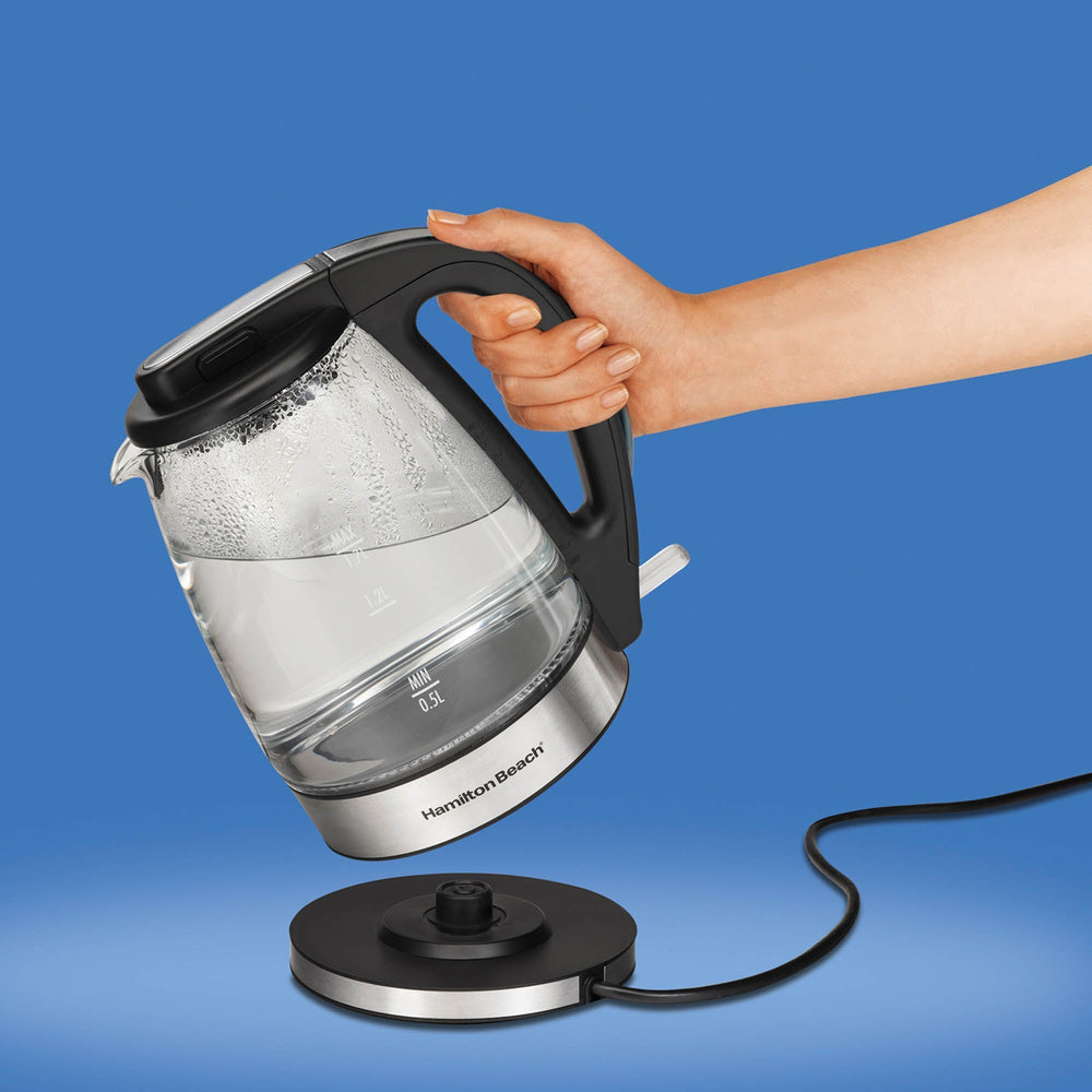 Calienta agua en instantes de la forma más fácil y segura con la Tetera de Vidrio de 1.7 Litros de Hamilton Beach.