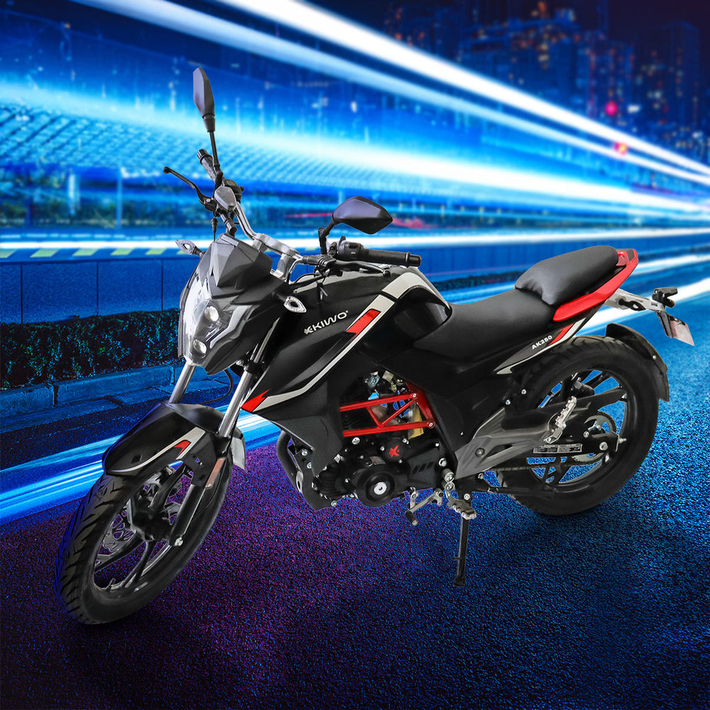 La Kiwo Ak250 posee un contundente motor 250 c.c. y un desempeño deportivo que le añade una diversión a los caminos más tediosos. Su escape corto HPF con filtro de doble sonido acentúa los tonos roncos del motor.