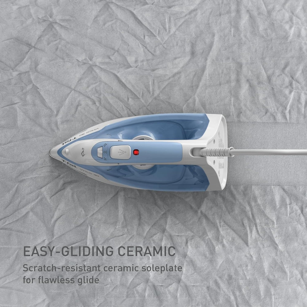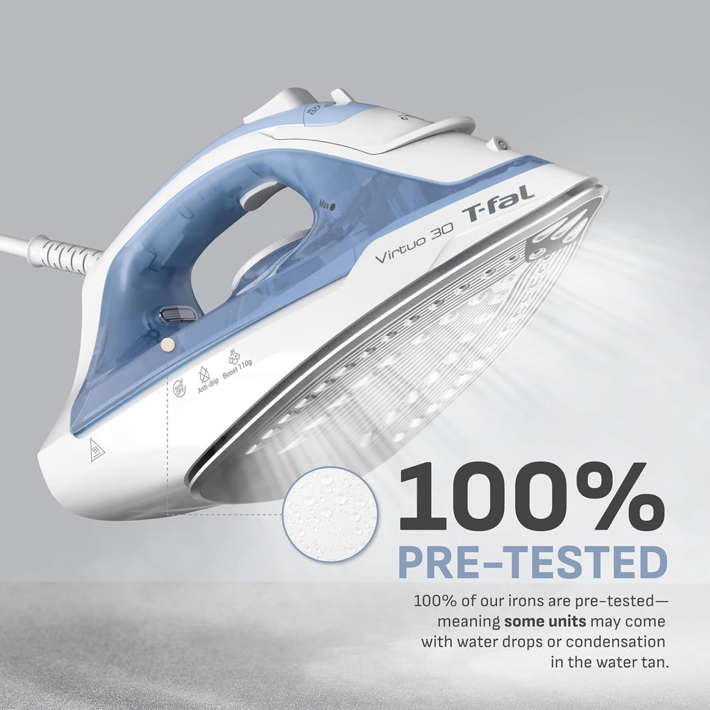- La Plancha T-FAL Virtuo 30 Azul combina potencia y precisión para resultados profesionales. Su suela de cerámica extra grande ofrece máxima resistencia y cobertura uniforme, mientras que la punta especializada accede fácilmente a zonas complicadas como botones y cuellos. Con 1400 watts de potencia genera 110 gr/min de vapor para eliminar arrugas persistentes sin esfuerzo. El sistema anti goteo protege tus prendas de manchas, y el rociador integrado facilita el tratamiento de pliegues difíciles. La función de apagado automático garantiza seguridad: se desactiva tras 30 segundos sin movimiento sobre el burro o 8 minutos en reposo sobre su base.