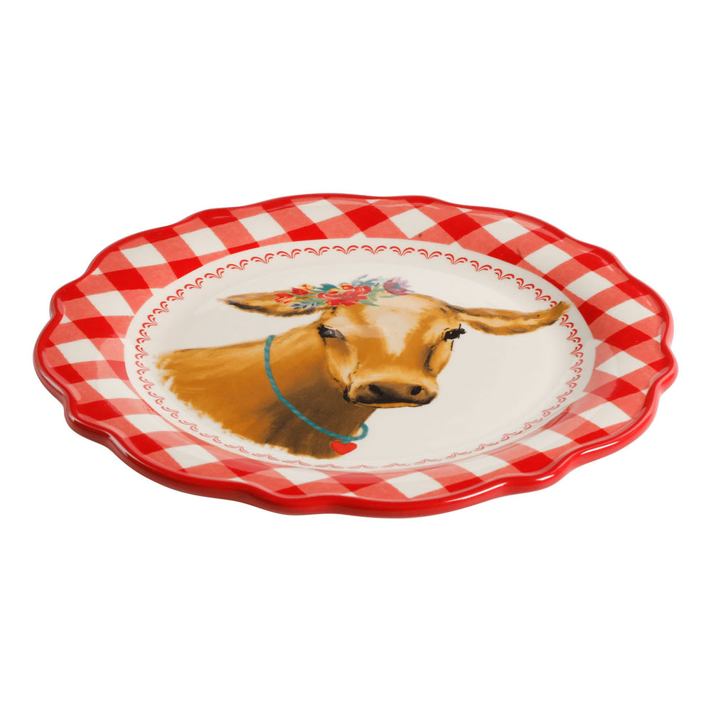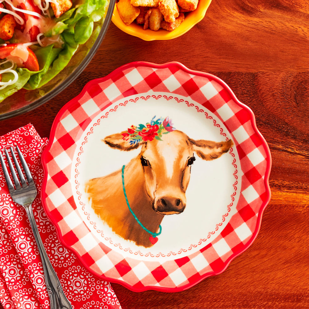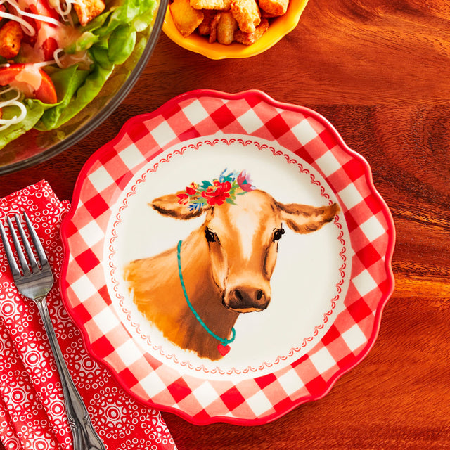 ¡Lleva el encanto del campo directo a tu mesa! Combina un diseño estilo picnic con cuadros vichy en rojo, una adorable calcomanía de vaca al centro y bordes festoneados vintage.