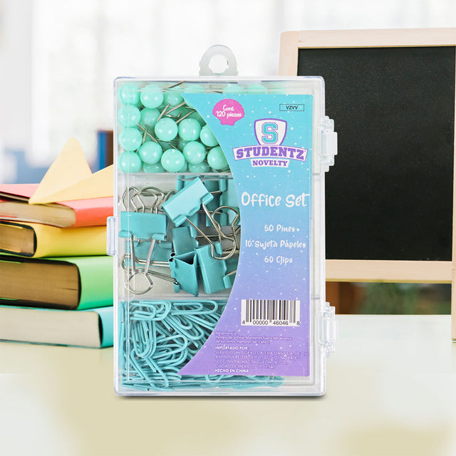 - Set de clips y accesorios esenciales para tu escritorio en casa u oficina.